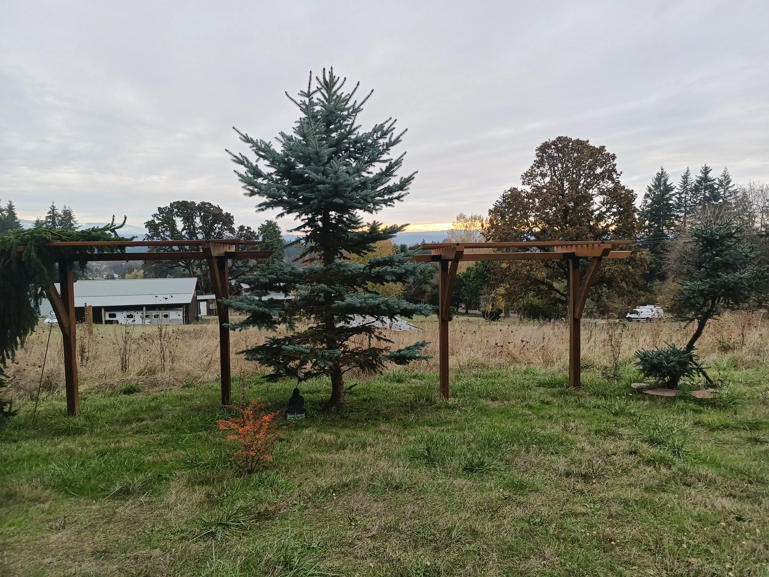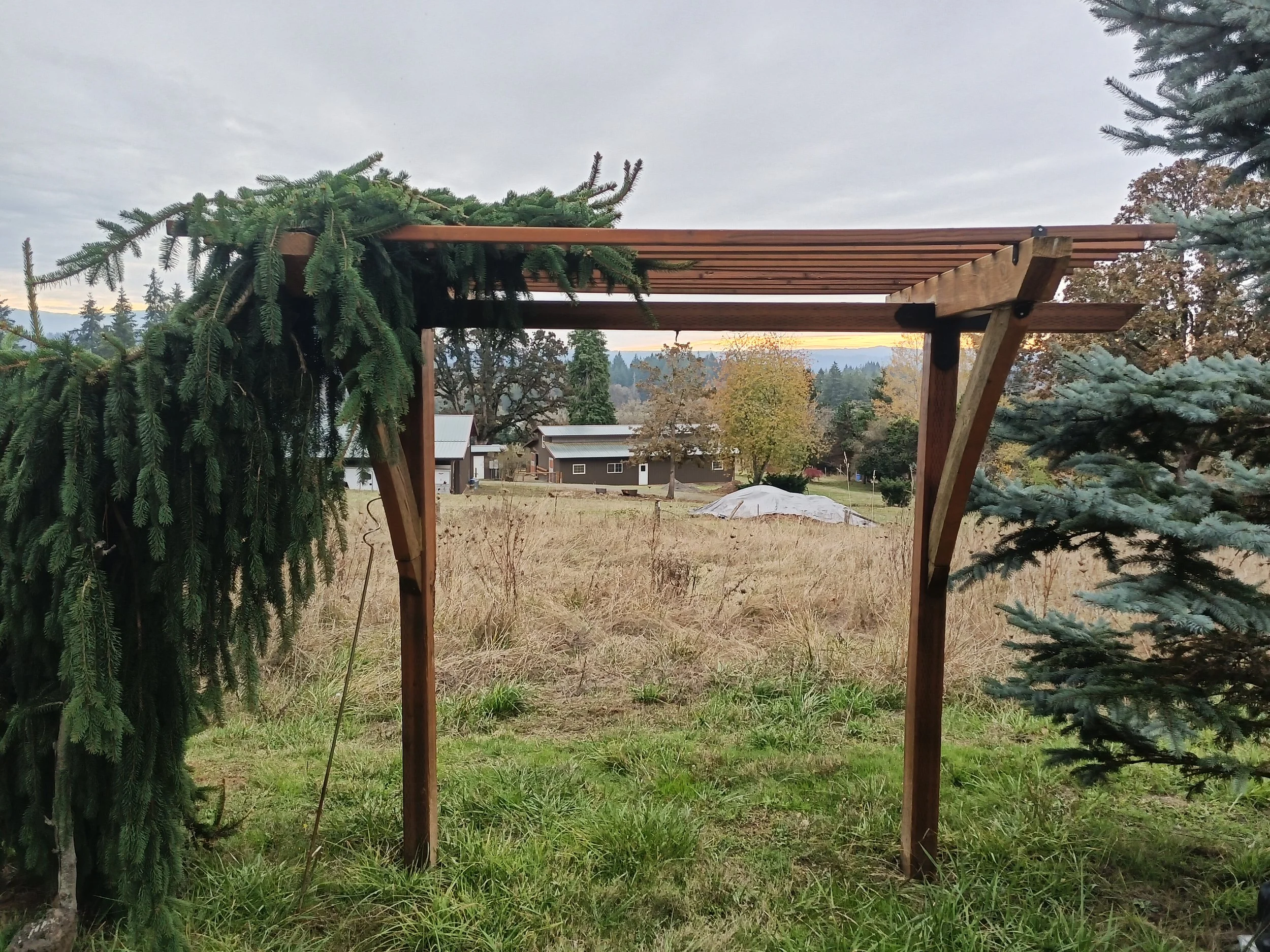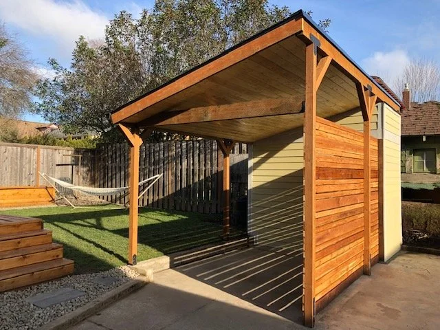 Indoor, outdoor lounge space meets residential shed. Beamed pergola look with industrial Simpson ties. Privacy wall for openness and shade coverage.